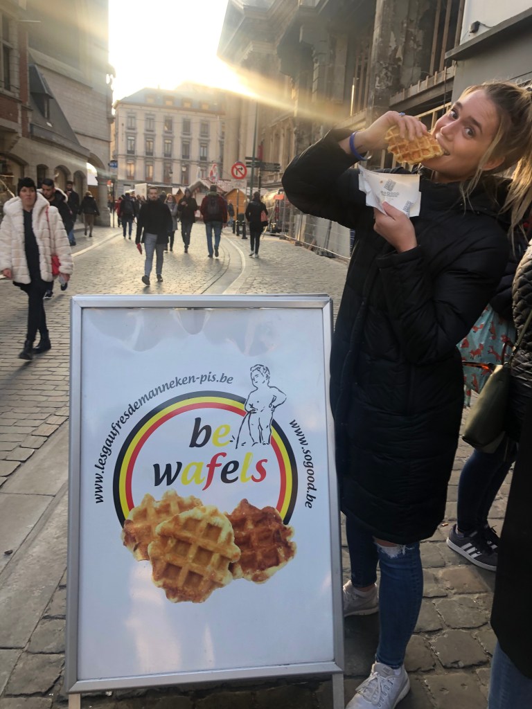 So, on to my first trip in Brussels. All I can say is that I had the absolute best time with the people I was with. The first night we got there, we went to dinner, and then went to explore the area surrounding our hostel. Christmas decorations are starting to be in almost every city I have traveled to, so that’s been really beautiful to see! On Saturday, we had our first full day, and that included going on a free tour of all of Belgium’s significant historical sights. We went to something called “La Grand Place”, which is a large square where the royals used to live. The buildings were amazing to see, and there was also a big Christmas tree in the middle! These free tours are tip based, and its a really inexpensive opportunity to learn more about the country that you are in! Here are some pictures of the beautiful architecture below!